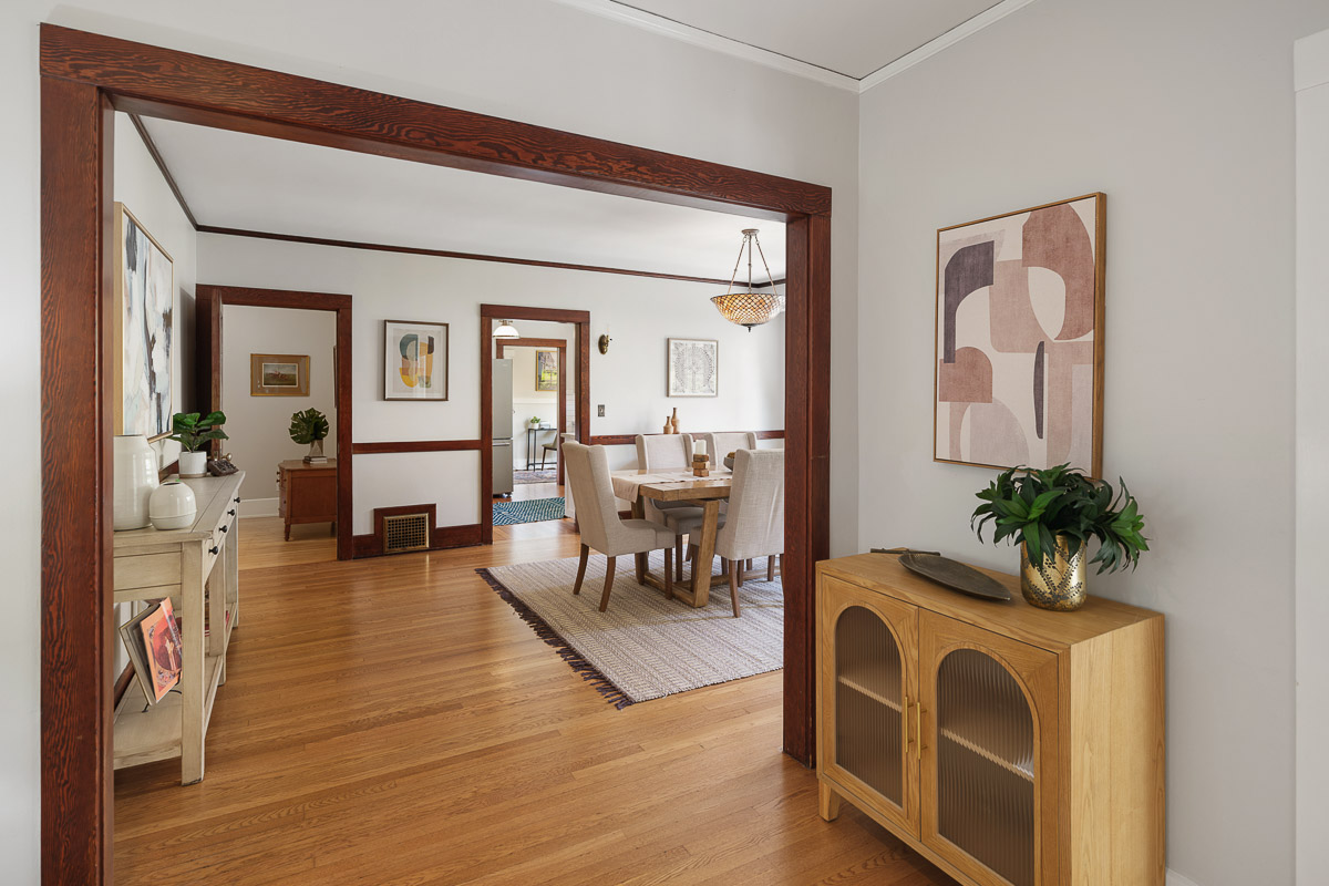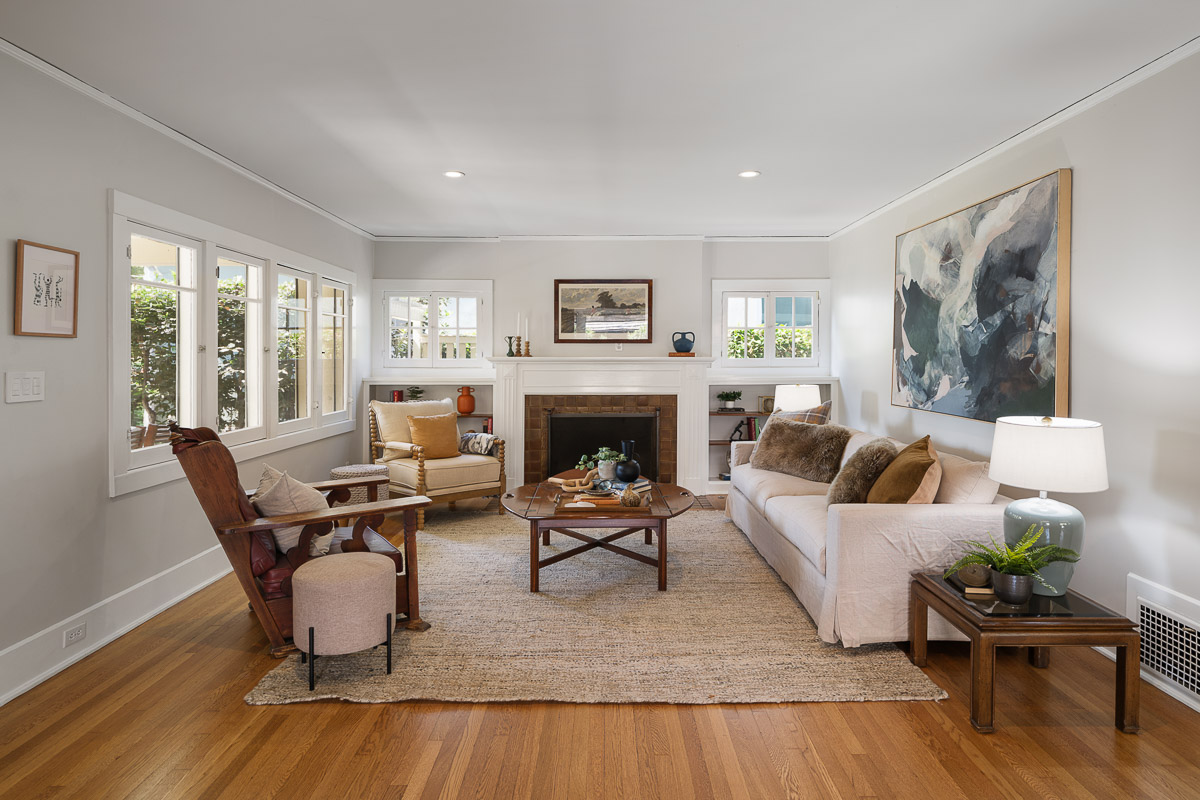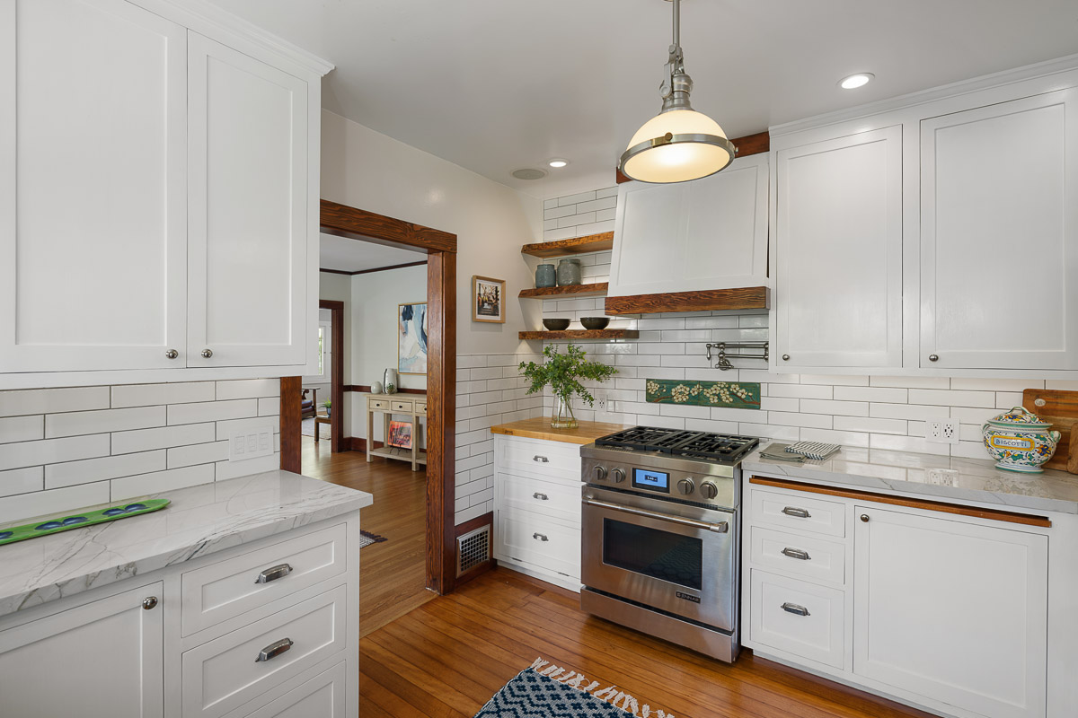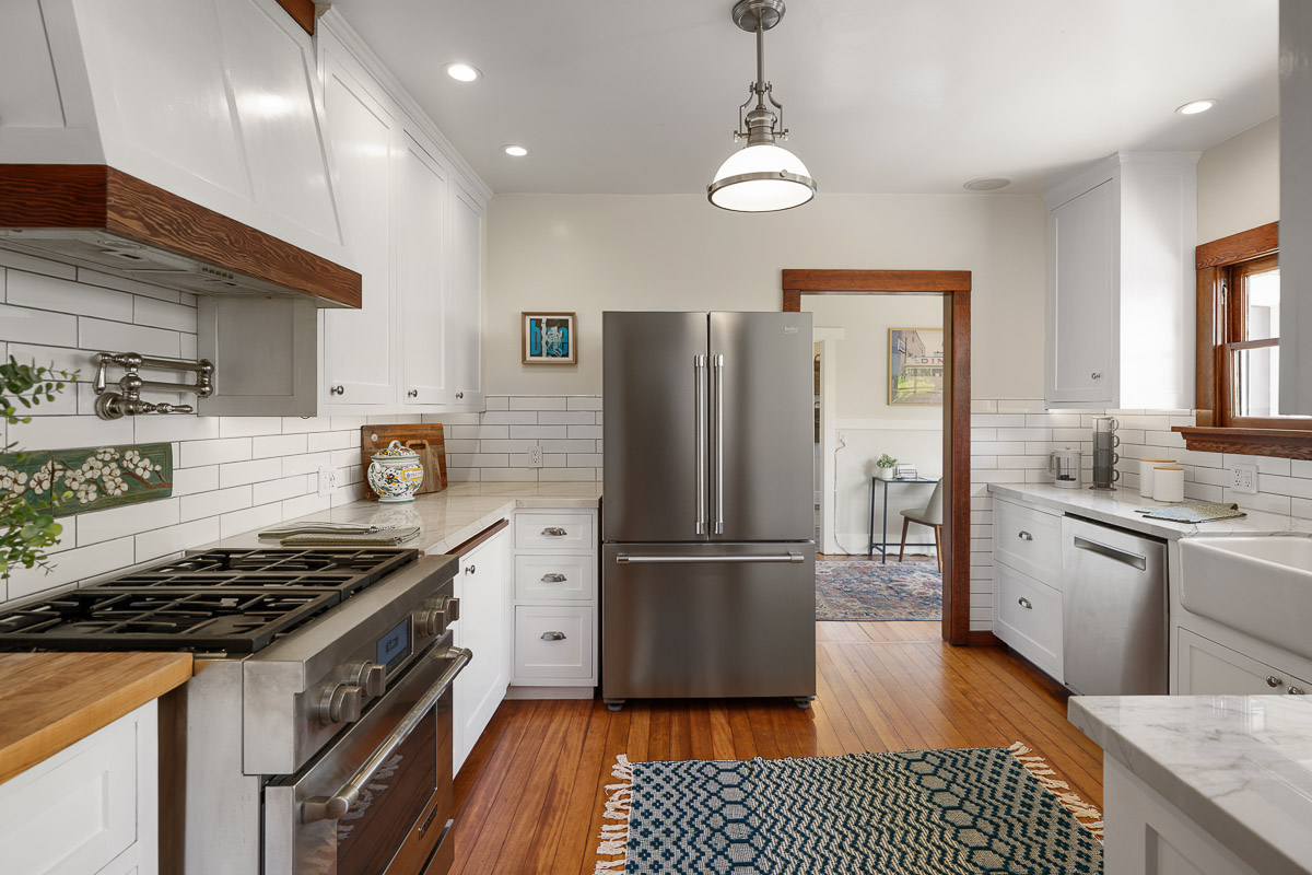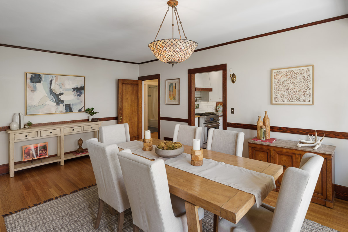 As you step up to the wide, inviting porch, you are beckoned in via a stately front door that leads into the living room with an impressive tiled fireplace framed by beautiful built-ins. From there you enter the central, formal dining room that has dark wood molding and tall French doors which let the light flood in. This adjoins the sun-lit, impeccably renovated kitchen, with stainless steel appliances, gleaming white cabinetry, an oversized Shaw farmhouse sink and stunning quartzite counters. There are three spacious bedrooms with two bathrooms that have been tastefully updated while remaining in keeping with the architecture of this highly desirable style. Additionally, there is a back mudroom, laundry area or multi-purpose space that steps out to the deep backyard.