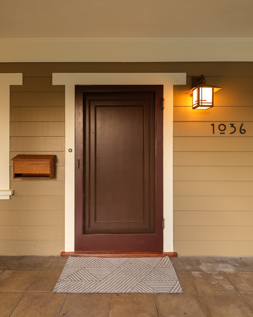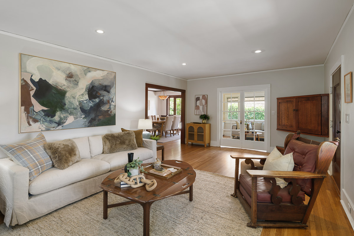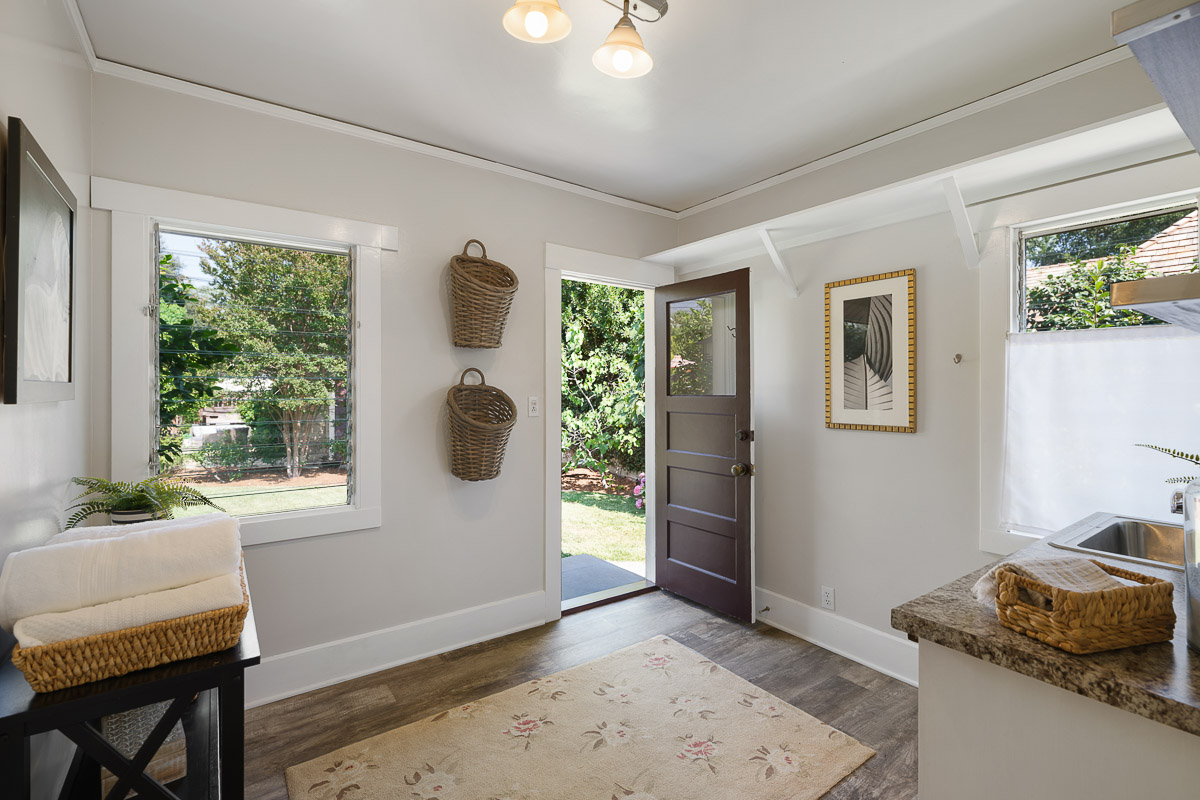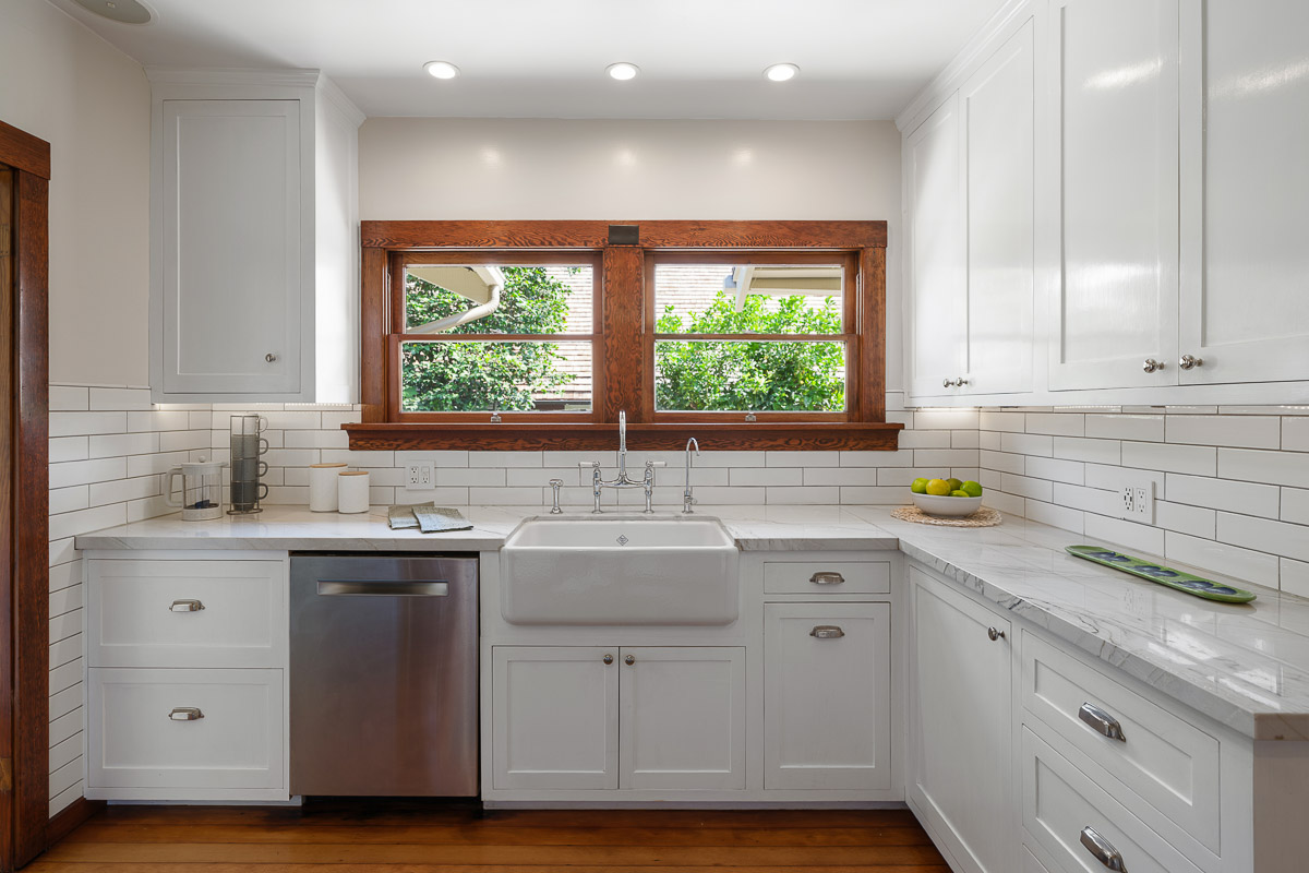 As you step up to the wide, inviting porch, you are beckoned in via a stately front door that leads into the living room with an impressive tiled fireplace framed by beautiful built-ins. From there you enter the central, formal dining room that has dark wood molding and tall French doors which let the light flood in. This adjoins the sun-lit, impeccably renovated kitchen, with stainless steel appliances, gleaming white cabinetry, an oversized Shaw farmhouse sink and stunning quartzite counters. There are three spacious bedrooms with two bathrooms that have been tastefully updated while remaining in keeping with the architecture of this highly desirable style. Additionally, there is a back mudroom, laundry area or multi-purpose space that steps out to the deep backyard.
